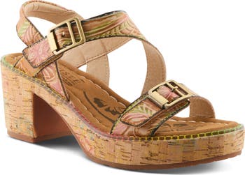 A corked-wrapped platform and heel bring earthy texture and just-right height to a stylish sandal designed with signature embossed-leather straps, hand-painted flowers and rainbow stitching.