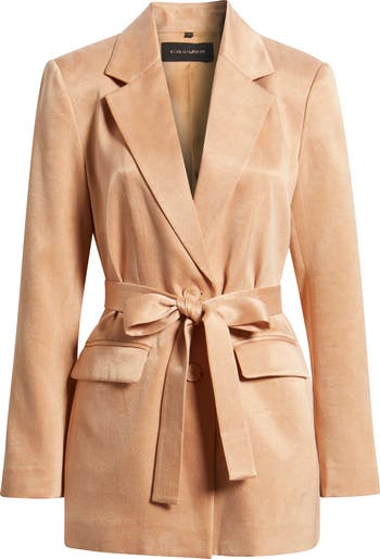 Textured in buttery soft faux suede, this tailored longline jacket is detailed with a waist-defining tie belt.