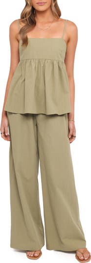 A flowy fit adds an effortlessly chic, laid-back look to this coordinated cotton set that pairs a babydoll cami with wide-leg pants.
