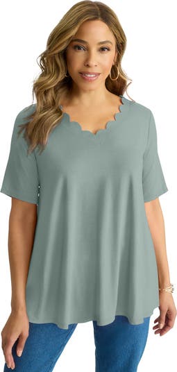 - This feminine tunic features a flattering V-neckline that's finished with a sophisticated scallop trim. Layer this essential tunic over all your favorite bottoms &ndash it's perfect to style for a special occasion or keep casual. Trapeze silhouette V-neck with Scallop detail Short sleeves 30&rdquo inseam Rayon/spandex Machine washable Imported
