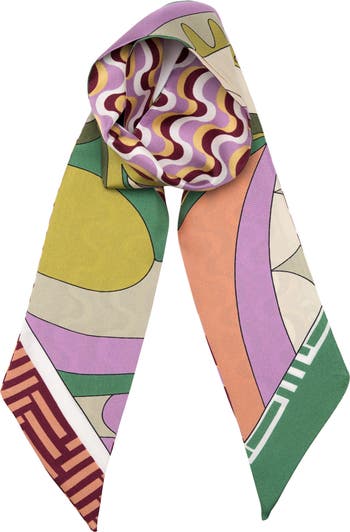 This twilly scarf features elegant geometric patterns in earth tones and greens. It’s double sided which ensures a polished look however you choose to style it. Accent your handbag, create a distinctive wrist wrap, weave it through your hair, or add a refined touch at your neck. Handmade from the finest Italian silk twill, this versatile piece adds refined elegance to any ensemble.