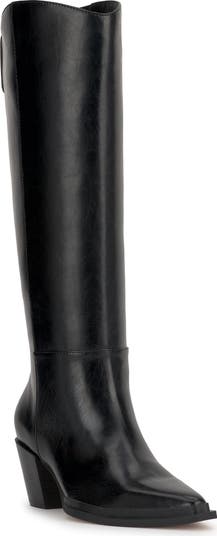 A subtly curved topline and pointy toe further the streamlined profile of a faux-leather boot shaped in a knee-high profile and lifted by a stacked heel.