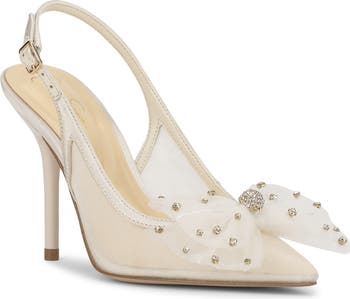 Glinting jewel embellishments and a frothy bow add evening-ready opulence to a slingback mesh pump framed by a pointy toe and lofty stiletto heel.