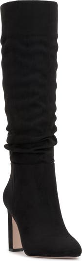 This slouchy knee-high boot elevates you on a towering shaved block heel.