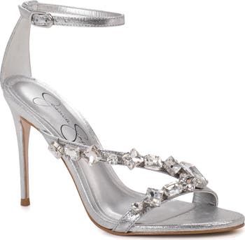 Faceted jewels embellish the asymmetric vamp straps on a glam sandal lifted by a towering stiletto heel.