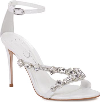 Faceted jewels embellish the asymmetric vamp straps on a glam sandal lifted by a towering stiletto heel.