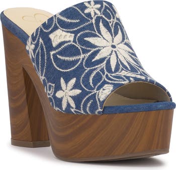 Floral embroidery and a wood-grain platform play up the vintage-vibes of this outfit-elevating sandal.