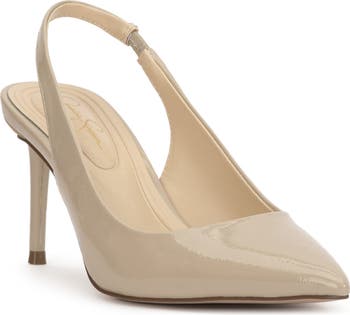 A pointy toe and stiletto heel balance a striking pump secured with a stretchy slingback strap for a comfortable fit.