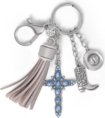 Rustic charm meets function in this Jessica Simpson keychain featuring a turquoise-style cross, metal tassel, and layered charms in a silver-tone finish.