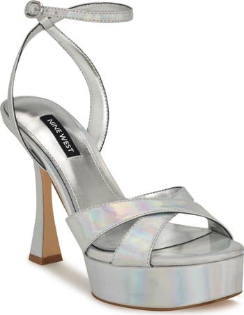 Crisscrossing vamp straps create modern dimension on a retro-cool sandal lofted by a chunky platform and soaring flare heel.