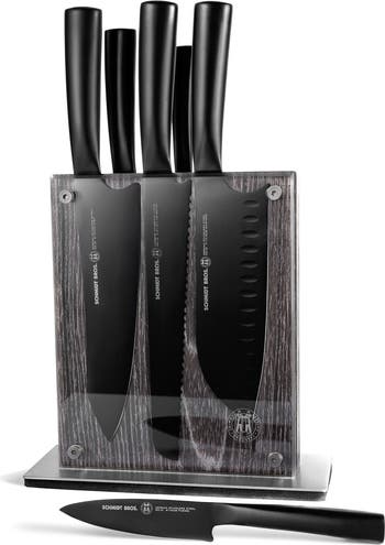 Traveling at Mach 5 to your kitchen counter comes the Schmidt Brothers Jet Black 7-Piece Knife Set, made with a pure matte black titanium finish. Each knife is made from a single piece of the finest 100% German Stainless Steel finished in pure matte black titanium. And they have the patented Schmidt Brothers Curve® so you can cut through all of your food with ease. What else would you expect from a knife made from the same material as an F-15 fighter jet?
