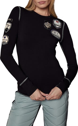 Show your affinity for the slopes in this brushed-back T-shirt marked with patches from resorts around the world.