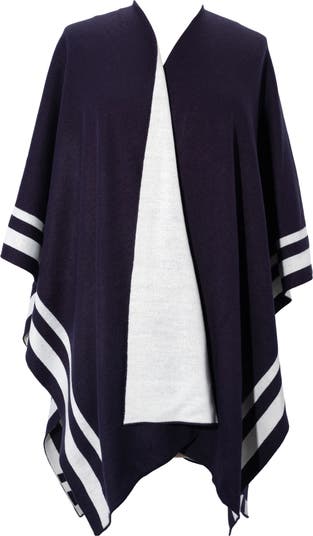 Keep your look perfectly polished on the go with a stripe-trimmed knit poncho that's reversible for double the styling options.