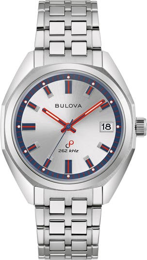 Classic 1970s style meets modern precision in this distinguished Bulova watch featuring interchangeable bracelet and blue leather straps. The Precisionist 262 kHz movement and continuous-sweep second hand maintain impeccable accuracy, while the red and blue details on the dial and strap channel an old-school aesthetic.
