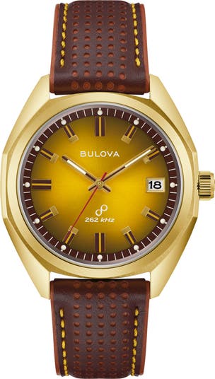 Classic 1970s style meets modern precision in this distinguished Bulova watch featuring a butterscotch gradient sunray dial.The Precisionist 262 kHz movement and continuous-sweep second hand maintain impeccable accuracy.