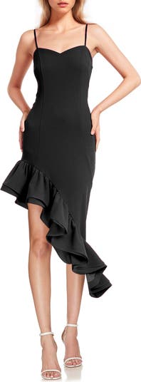 This party-perfect sleeveless frock is designed with slender adjustable straps and decadent diagonal ruffles.
