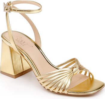 Svelte straps are knotted at the vamp of a stylish ankle-strap sandal balanced by a square toe and flared heel.