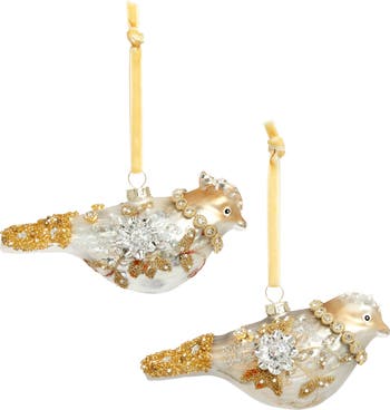These are elegant bird-shaped Christmas ornaments designed with a luxurious touch. Each bird features gold and silver embellishments, including intricate beadwork, glitter accents, and a central jeweled snowflake motif. They hang gracefully from soft golden velvet ribbons, adding a touch of sophistication and sparkle to any holiday décor.