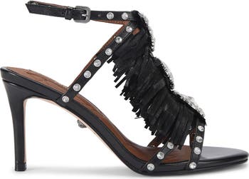 Swingy fringe and opulent jewel embellishments saunter down a party-ready sandal lofted by a svelte heel and secured with an adjustable buckle closure.