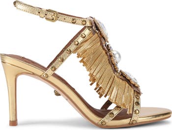 Swingy fringe and opulent jewel embellishments saunter down a party-ready sandal lofted by a svelte heel and secured with an adjustable buckle closure.