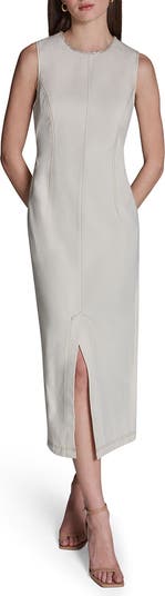 Side-and-back seams bring a tailored look to this jewel-neck sheath dress fashioned in a midi length and finished with a leg-baring front slit.