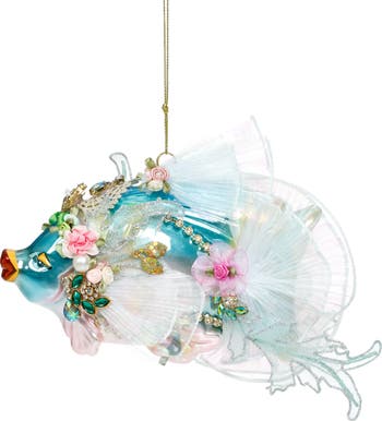 The Blue Jewel of the Sea Fish Ornament shimmers with oceanic elegance, featuring iridescent blue tones and delicate jeweled embellishments. Adorned with pearls, flowers, and sparkling gems, it captures the whimsical beauty of underwater fantasy. Perfect for adding a touch of luxury and charm to any holiday or coastal décor.