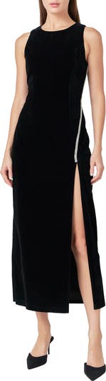 Lustrous rhinestones and a daring side slit bring the wow-factor to this sleeveless night-out maxi crafted from sumptuous velvet.