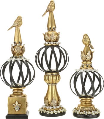 This elegant set of jeweled bird-topped finials features intricate metalwork combining antique gold and black finishes for a sophisticated look. Each piece is crowned with a finely detailed bird perched atop ornate floral and crystal accents. Perfect as decorative accents for mantels, consoles, or bookshelves, these finials add a touch of vintage charm and opulent artistry to any space.