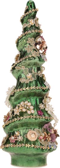 This jeweled Christmas tree shimmers in a green hue, wrapped in cascades of pearls and golden beads. Adorned with delicate floral brooches, gemstones, and sparkling crystals, it radiates opulence and festive charm. Every curve gleams with elegance, turning the tree into a dazzling holiday treasure.