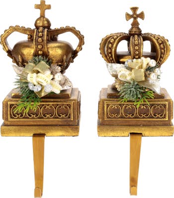 These jeweled crown stocking holders add a regal touch to your holiday décor. Crafted in elegant gold with intricate detailing, each crown features festive embellishments of greenery, ribbons, and pearls. Perfect for mantel displays, they combine classic charm with functional design for hanging Christmas stockings in royal style.