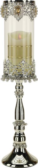 The Mark Roberts Jeweled Hurricane Pillarholder, 21″ is an elegant decorative candle holder featuring a tall, jeweled hurricane design perfect for showcasing pillar candles or serving as a striking standalone décor piece