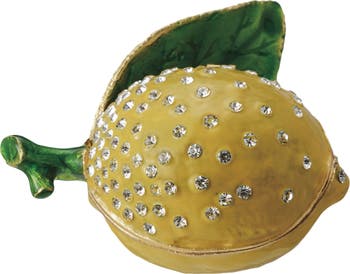 - A zesty addition to any collection, this enameled metal trinket box is shaped like a ripe lemon, adorned with jewels and finished in gold