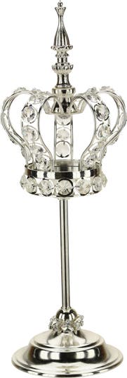 The Mark Roberts Jeweled Royal Crown on Pedestal stands 15 inches tall and exudes regal elegance with its ornate design and sparkling crystal accents. Intricately detailed jewels and metallic finishes give the crown a luxurious, heirloom-quality appearance. Displayed on a decorative pedestal, it makes a striking statement piece for holiday décor or year-round royal-themed displays.