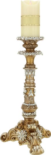 This 19-inch jeweled pillar candleholder exudes opulent elegance with its intricate gold finish and ornate baroque detailing. Embellished with sparkling crystal accents, it adds a touch of luxury and sophistication to any décor. Perfect as a centerpiece or statement accent, it brings timeless charm and refined beauty to any room.