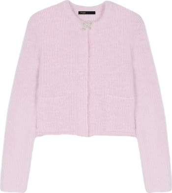 This collection marks a bold return to the city, where comfort blends with style, and every detail counts.This short, sky-blue knit cardigan, made partly from alpaca, has a straight cut and a fluffy texture. A sparkling jewel bow at the neckline and two refined patch pockets define this characterful piece.For an modern silhouette, wear it over a white shirt with lace details and grey flare jeans, and add a Miss M mini for a touch of character.