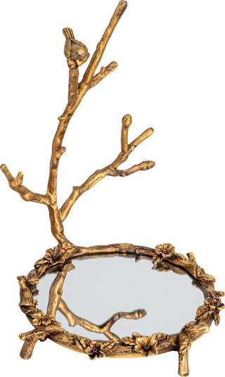 - A quaint and charming piece, this pewter jewelry holder features a delicate bird on a branch, complete with a mirror, in an antique gold finish