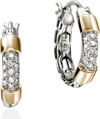 These two-tone hoop earrings are artisan handcrafted with John Hardy's signature carved chain motif and a finely set pavé diamonds.