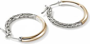 A split design gives twice the shine to hoop earrings handcrafted with polished 14-karat gold and engraved sterling silver.