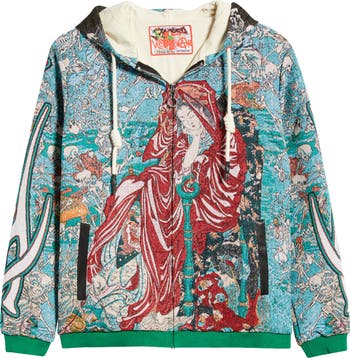 Dramatic Japanese artwork stands out boldly on this boxy-cut jacket completed with a sturdy drawstring hood.