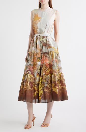Autumnal themes define a sleeveless cotton shirtdress cinched with a sash and perfected with a pair of pockets.