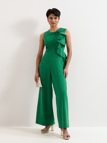 A statement jumpsuit of sculpted tailoring, cascading ruffle and flowing wide-leg drape designed for memorable evening occasions.