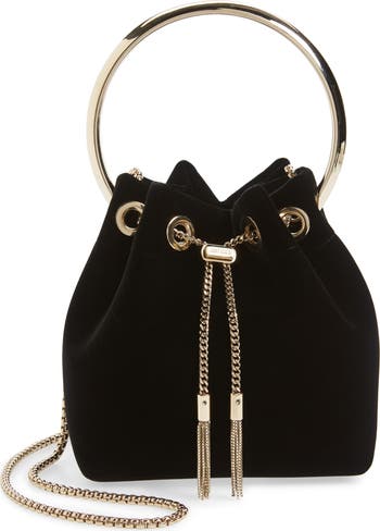 Polished hardware gleams against the velvety-soft silhouette of a statement-making bucket bag that can be held in your hand or over your shoulder.