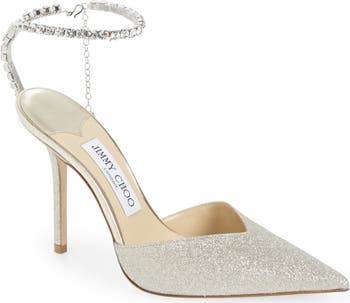 Glamorous from every angle, this glitter-dusted pointy-toe pump features a radiant, jewelry-like strap and a crystal-tipped chain that swings with every step. A faceted teardrop crystal is suspended at the heel.
