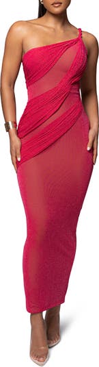 Beguile in this sparkling-mesh body-con gown topped by a single rope-twist shoulder strap and wrapped in bias stripes of ruching.