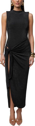 Make it a night to remember in our AUBREE MIDI DRESS. This alluring combo dress features a sleeveless bodysuit with a mock neckline and a thong back with bottom snap closures. Attached towards the lower waist is a wrap skirt that ties on one side to create a knotted detail with a stylish slit. Designed in a luxe slinky fabric for a touch of elegance. Double lined. Stretchy.
