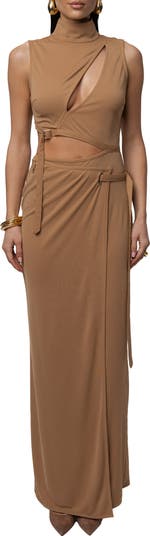 Our Behind The Scenes Dress is perfect for nights that call for a bit more edge. Crafted from lightweight stretchy fabric, this maxi dress features cutout details across the chest and midriff, accentuated by gold-tone details throughout for an elegant touch. The high mock-neck collar and wrap-style skirt with a thigh-high slit add refinement. Designed to flatter and captivate, this maxi dress is ideal for glamorous evenings or upscale occasions. Neck closures. Single-lined.