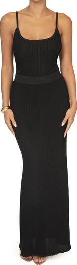 Sweet lettuce hems give a feminine finish to this svelte, shimmery-knit set comprised of a scoop-neck camisole and a coordinating skirt.
