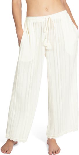 Lounge poolside in these textured wide-leg pants designed with a tassel-tie waist and lacy trim.