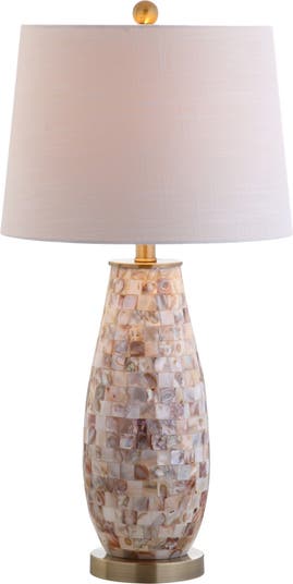 The elegantly curved base of this tall 28" table lamp is carefully adorned with a mosaic of square seashell tiles and brass accents. A slightly tapered white linen shade balances the look while a plastic-wrapped cord provides style all the way to the plug. You'll love how the shells reflect the warm glow of the bulb when illuminated and their many shades of natural beauty from ivory to bronze.