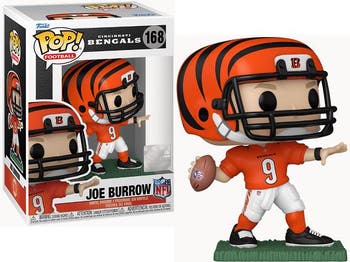 This NFL Cincinnati Bengals Joe Burrow Pop! Vinyl Figure #168 measures approximately 3 3/4-inches tall. Comes packaged in a window display box. AGES 3 AND UP